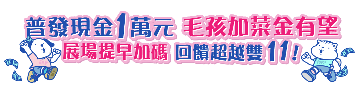 | 逛展抽 | 愛肯拿 1年份無穀狗飼料 or 無穀/凍乾貓飼料 | 10/31(五)-11/3(一)展期四天逛展者,至台北世貿一館『大會贈品處』參加。 | 11/3(一) 18:30 |