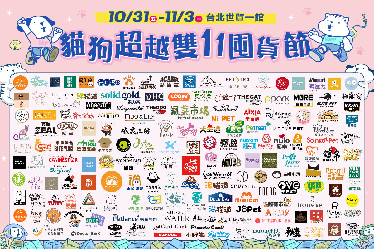 寵物展最強檔期來了!全台百大寵物品牌齊聚台北世貿一館,主食、保健、美容、推車、日用清潔、穿搭、玩樂到智慧家電,橫跨吃、穿、用、樂全品類一次到位,展場限定優惠3折起,再加碼多款熱銷商品加價購,讓你一次備齊整年度毛孩所需。現場不只好買,還更好玩:親手做毛孩健康點心【寵物鮮食手作】、考驗速度與穩定的【金鏟飼料賽】、溫暖療癒的【寵物心靈溝通】,名額有限,盡快報名!專屬毛孩的「超越雙11囤貨節」,家長瘋搶好物、毛孩負責可愛,就在台北世貿,等你一同進場狂歡!