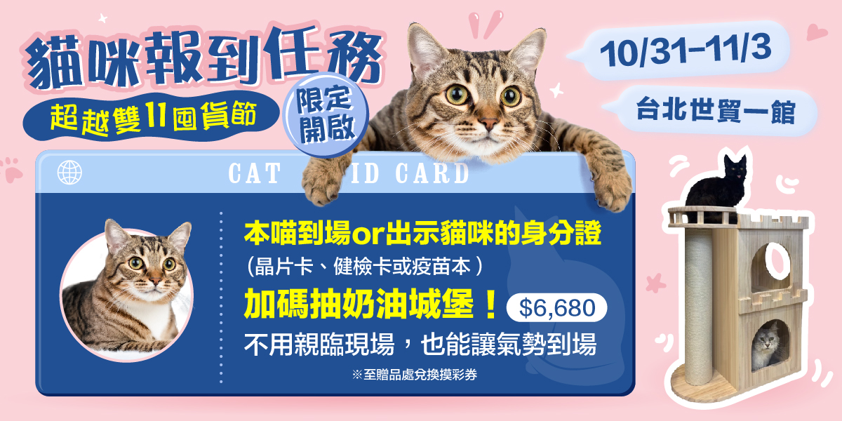 | 逛展抽 | 毛孩專科 潔牙粉20g+貓咪免疫粉30入 | 10/31(五)-11/3(一)展期四天逛展者,至台北世貿一館『大會贈品處』參加。 | 11/3(一) 18:30 |