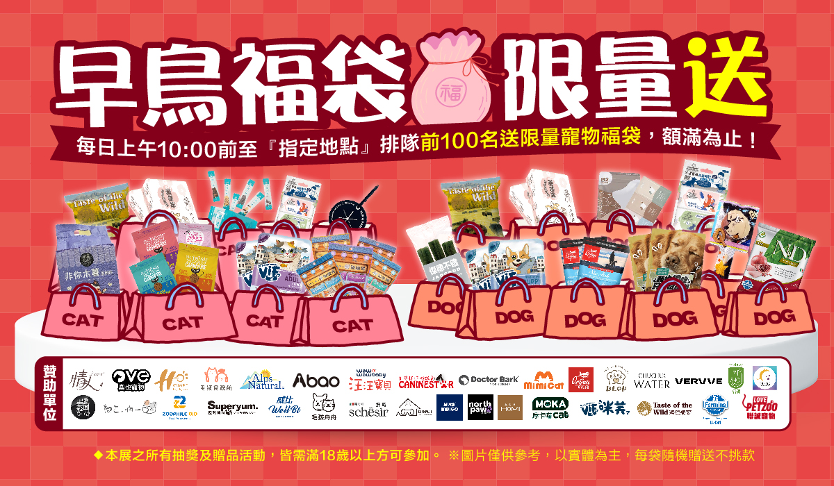 呼叫早起的小毛孩!每日10:00前至指定地點排隊,前100名(50份汪汪款+50位喵喵款)限量早鳥福袋額滿為止!🐾