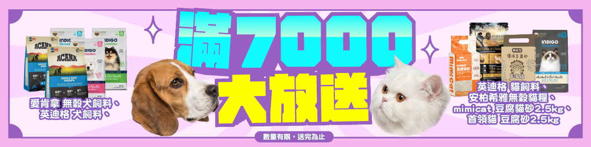 大會滿7千加碼優惠二: 加碼送:愛肯拿 無穀犬飼料、英迪格 犬/貓飼料、歐力 無穀貓寵糧、安柏希雅 無穀貓糧、mimicat 豆腐貓砂、首領貓 豆腐砂等好禮,數量有限、送完為止!