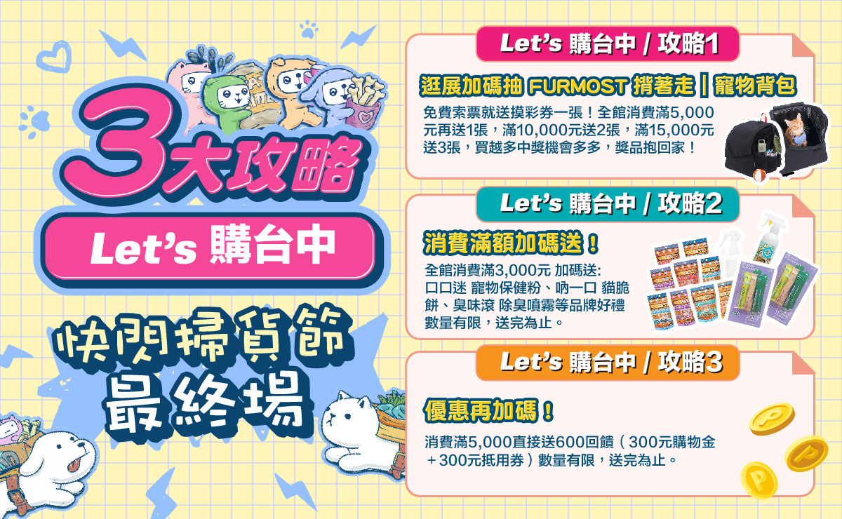 百大寵物用品齊聚 限時優惠全面開啟 現場集結飼料、罐頭、凍乾、玩具、保健、美容、清潔、服飾、推車、牽繩等多元商品,打造一次購足的超值盛會!限定掃貨優惠低至3折,更有箱購優惠、買A送B、團購優惠、組合優惠、超值加價購等多種折扣,挑戰市場最低價! 不論是補貨還是換季升級,來這裡就對了!快閃四天不只價格給力,還有品牌聯名限定、每日限量搶購、全館消費滿$5000再送$600(數量有限,送完為止)等精彩活動不間斷,從飼料到用品全包辦,毛孩換季好物一步到位!