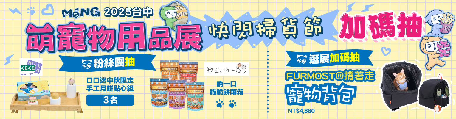 展前 粉絲團抽獎 | 吶一口 貓脆餅兩箱 1名 | 索票後於9/10(三)16:00前至FB粉絲團「Méng 萌潮」線上完成按讚追蹤+分享置頂貼文 | 9/10(三) 18:00 |