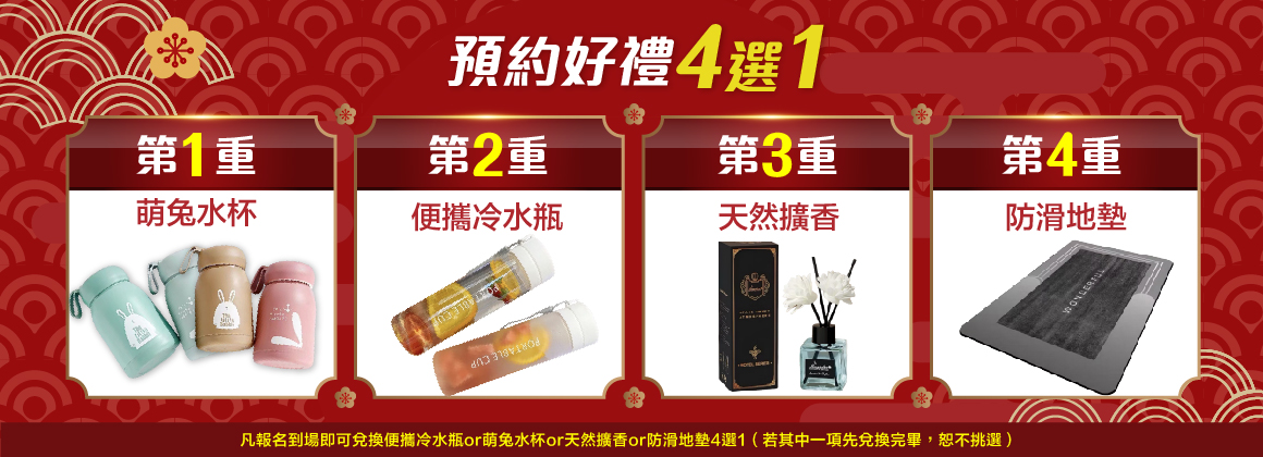 凡報名到場即可兌換便攜冷水瓶or萌兔水杯or天然擴香or防滑地墊4選1(若其中一項先兌換完畢,恕不挑選)