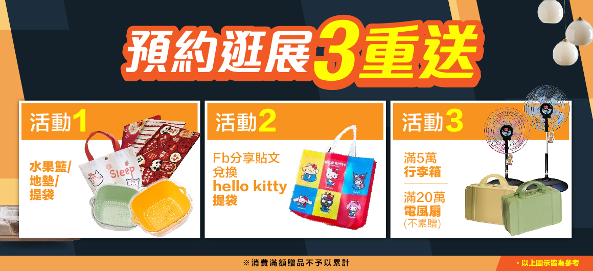 活動3:消費滿5萬加碼贈行李箱;消費滿20萬加碼贈電風扇。※消費滿額贈品不予以累計