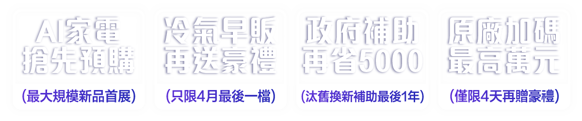 為防止每年暑期夏季家電師傅大排長龍安裝數過多之情形,各大冷氣.冰箱等品牌紛紛推出早販優惠再加碼,凡4/10-4/13至台北電器展除了享有展場驚爆加碼優惠之外,冷氣再享數千元品牌豪禮多選1之回饋,期盼大家能早挑選早享受;再來電視也推出新品,正值新舊機種交替期品牌推出最殺、最大促銷折扣,買家電4月這場絕對是一整年度最佳採購的好時機,同時更能保障安裝師傅之施工品質與安全性!