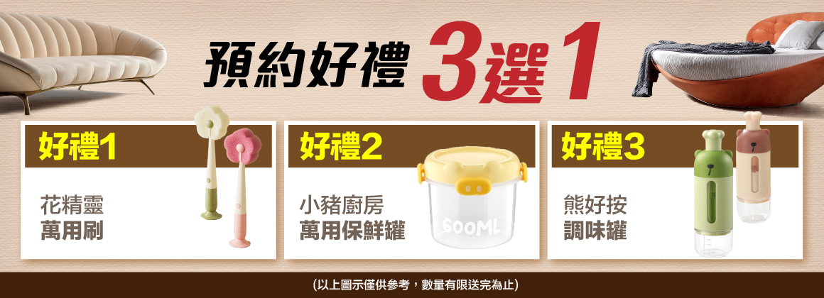 第一重:逛展送限量好禮:「花精靈 萬用刷」、「小豬廚房 萬用保鮮罐」、「熊好按 調味罐」好禮3選1!數量有限,送完為止!如其中一項先兌換完畢,將以現場提供品項為準,恕不挑選。 第二重:攜帶尺寸圖或家配圖,專業設計師團隊現場免費裝潢設計。